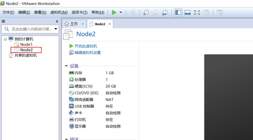 那么就会在 VMware 主界面发现我们刚刚创建的 虚拟机 Node2