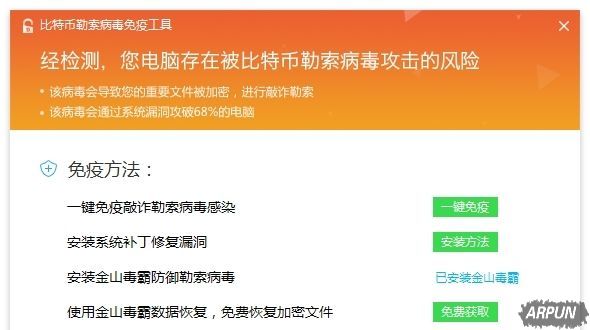面对肆虐的Onion、WNCRY两类勒索病毒变种在全国范围内出现爆发的情况,金山毒霸中心已紧急发布比特币勒索病毒免疫工具...