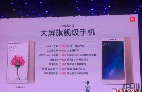 小米发布新一代大屏手机小米Max2,该机采用6.44英寸超大屏幕,升级至5300mAh充电宝级的超大电池,后置1200万...